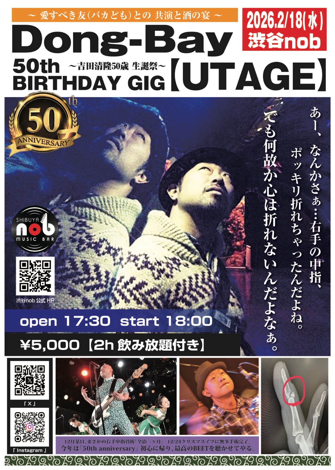 Dong-Bay 50th BIRTHDAY GIG【UTAGE】 Dong-Bay 50th BIRTHDAY GIG【UTAGE】 Date 2026年2月18日(水) Open 17:30 Start 18:00 Close Charge 5,000円(2時間飲み放題付) 詳細 出演
